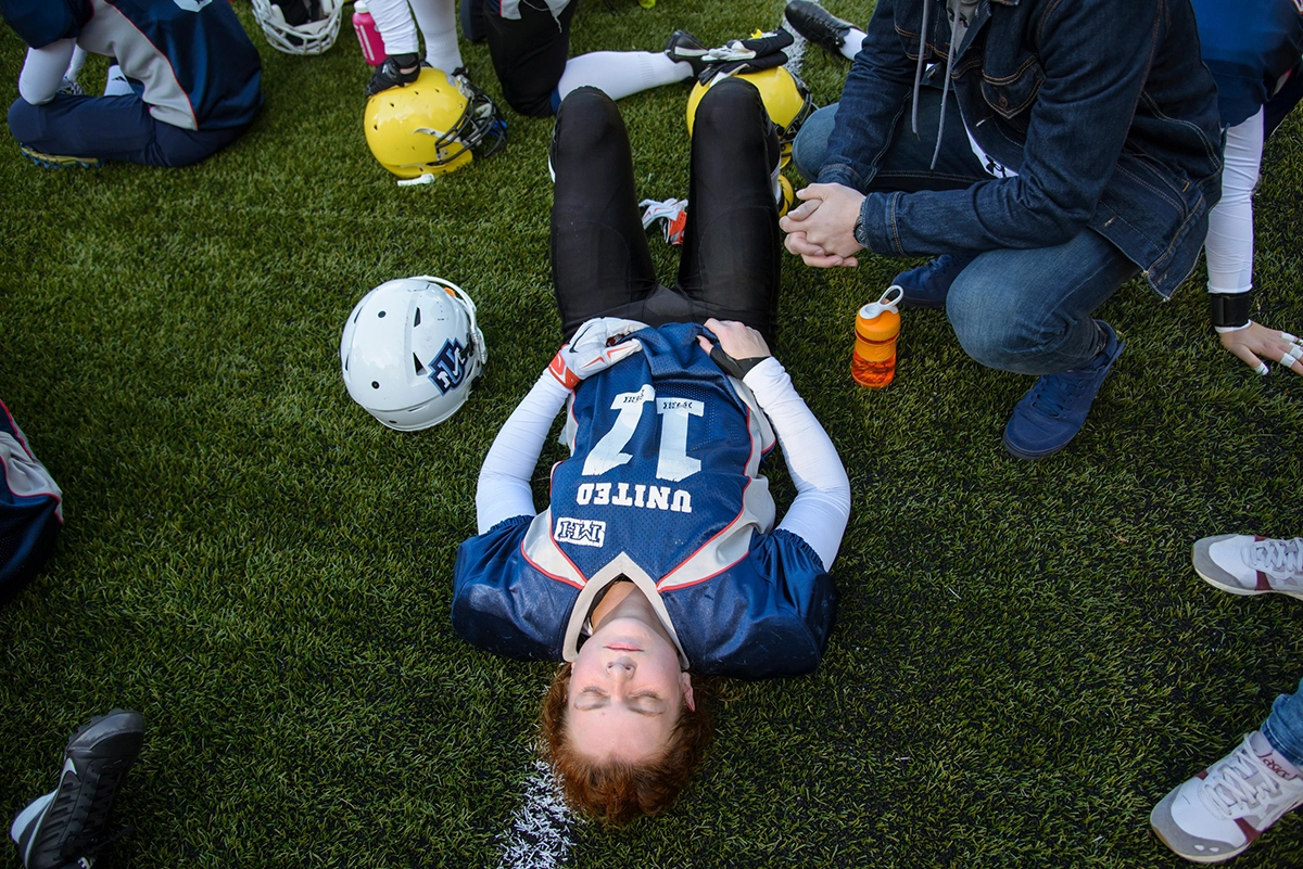 Лиза отдыхает на бровке поля во время матча.Большинству команд не удается укомплектовать полный состав, поэтому опытным игрокам приходится выходить на поле на разных позициях, что физически дается тяжело. Фото: Кристина Бражникова | Гласная