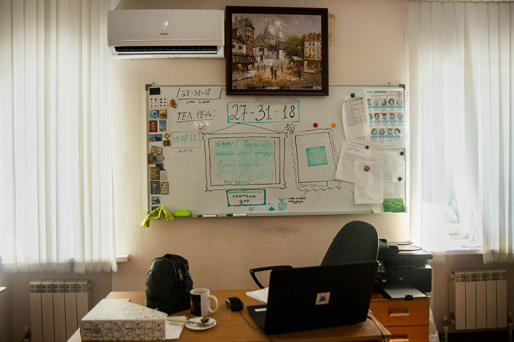 Таблички на двери одного из кабинетов — «Штаб мысли» и «Доктор Добро» — выдают его хозяйку: главного редактора саратовских «Свободных».