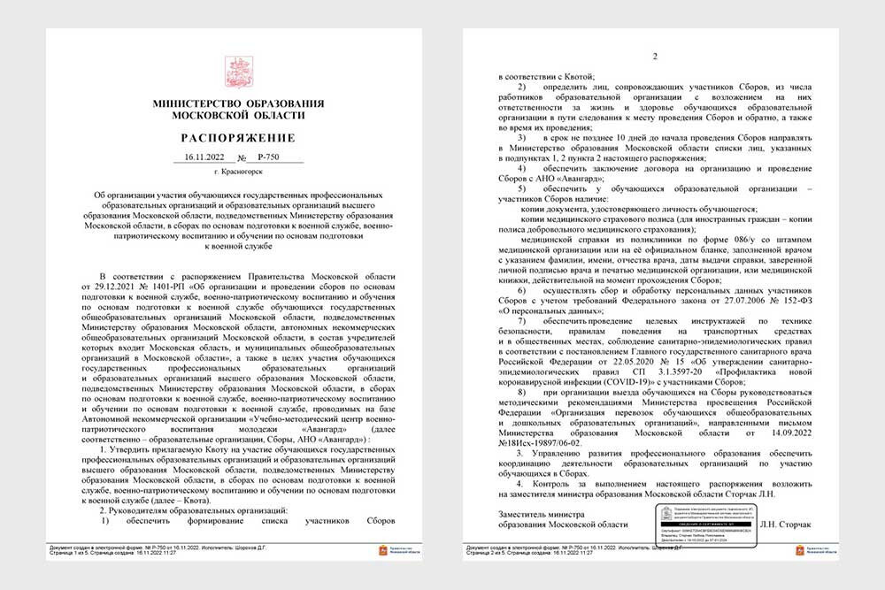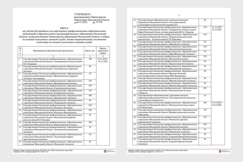 Распоряжение Минобразования Московской области о сборах было подписано 16 ноября. Согласно документу, колледжи и вузы должны отправить на сборы начальной военной подготовки от 30 до 450 совершеннолетних студентов, квота указана на каждое учреждение.