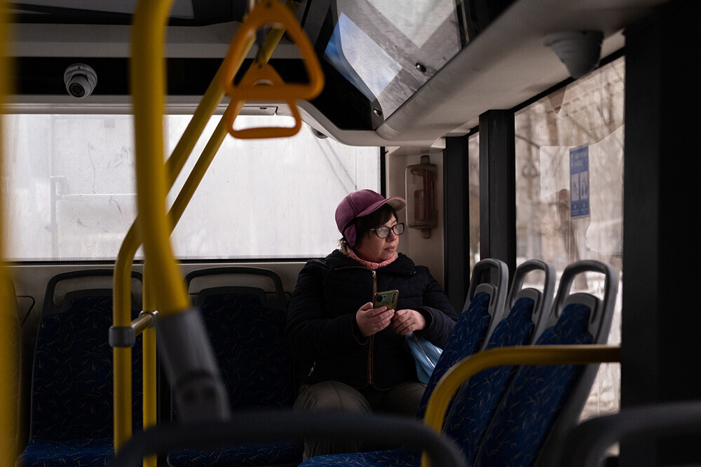 Аня в троллейбусе на пути на работу, на своем любимом месте в конце у окна. Фото: Гласная