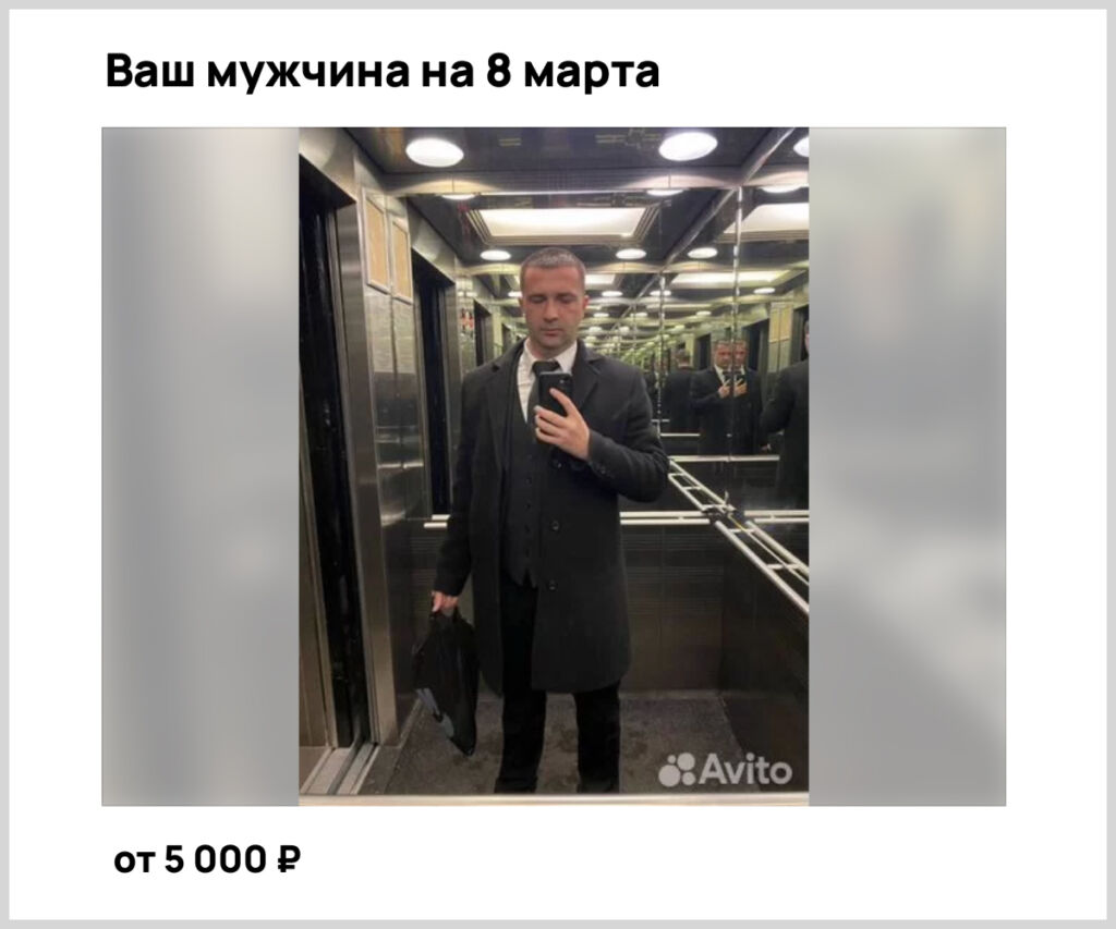 Накануне 8 Марта в сети все чаще можно встретить предложения от мужчин, которые готовы за умеренную (или не совсем) плату стать на один день компаньонами для одиноких женщин: встретить с работы на глазах у коллег, беззаботно поболтать с мамой на семейном ужине, подарить айфон (предварительно купленный самой женщиной). Объявления под заголовком «Тот самый мужчина на 8 Марта» стали появляться в этом году незадолго до праздника.