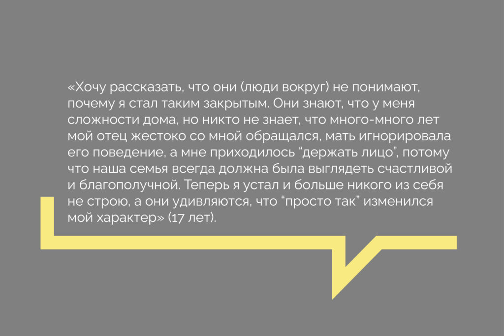Фантазии могут быть связаны с насилием, однако многие приходят в чат «просто проораться», уверяет Анна. Одна девочка писала, что бы сделала со всеми своими родственниками: как бы она их всех закопала, сожгла и вообще, «когда все это кончится». К концу беседы перечитывала и писала: «Ты же понимаешь, что я никого не трону, да?»