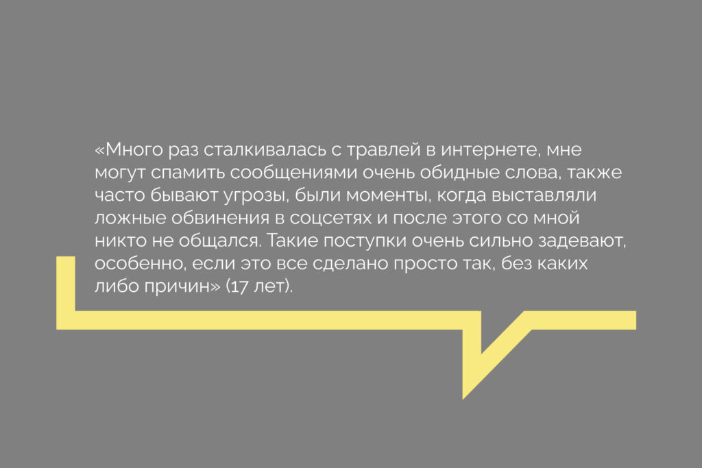 Теперь ей 20 лет, с сентября она выходит на смены и старается помочь тем, кто пока с трудом справляется сам. «Я очень хорошо помню, каково это — быть одной, — признается девушка. — То, что нет возрастной дистанции и мы говорим на одном языке, тоже помогает». По ее словам, определить, где травля, а где конфликт с одноклассниками, бывает непросто. В том числе потому, что сами подростки порой путаются в терминах: могут не идентифицировать ситуацию как буллинг или, напротив, называть буллингом ссору с друзьями.