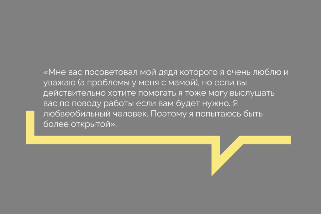 Сложность часто в том, что подростки до 15 лет не могут сами обратиться за помощью — только вместе с родителями. Но и в таких ситуациях консультанты стараются помочь. Например, сейчас Лидия работает с подростком, оба родителя которого имеют алкогольную зависимость. Пытается узнать, есть ли в его окружении теплый контакт с другими взрослыми, кому подросток может доверять, кому может рассказать о проблеме — чтобы они, в свою очередь, поговорили с его родителями.
