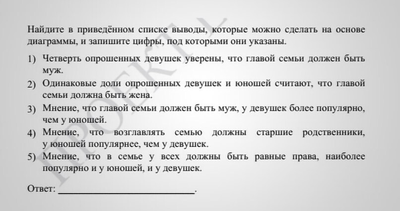 Например, в демонстрационной версии экзамена за 2026 год есть такое задание: «В ходе социологического опроса группы совершеннолетних юношей и девушек им задавали вопрос: “Кто должен быть главой семьи?” Найдите в приведенном списке выводы, которые можно сделать на основе диаграммы».