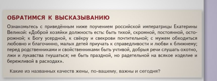 Для сравнения: в рубрике «Мысли мудрых», помещенной после каждого параграфа в учебниках за 10-й и 11-й классы, упомянуто 38 исторических фигур. Среди них только одна женщина — российская императрица Екатерина II. Кроме того, ни одна женщина не упомянута в пункте о современных достижениях российской науки в параграфе по теме «Наука» учебника за 8-й класс.