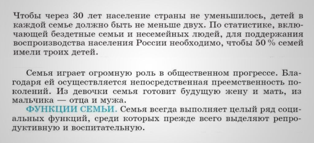 Учебники под редакцией Богомолова, используемые для подготовки к ЕГЭ, готовят школьников к тому, чтобы дать правильные ответы на подобные вопросы. Параграф о семье в учебнике для 9-го класса начинается со слов о том, что репродуктивная функция семьи — главная в обществе. Согласно тексту, это «особая, присущая только семье (в отличие от других социальных групп)» черта.