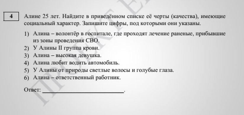 В одном из заданий в демонстрационном варианте ЕГЭ по обществознанию за 2026 год ученикам нужно выбрать личные качества девушки Алины, «имеющие социальный характер». При этом Алина — волонтерка в госпитале, где лечат «бойцов СВО», и «ответственный работник».