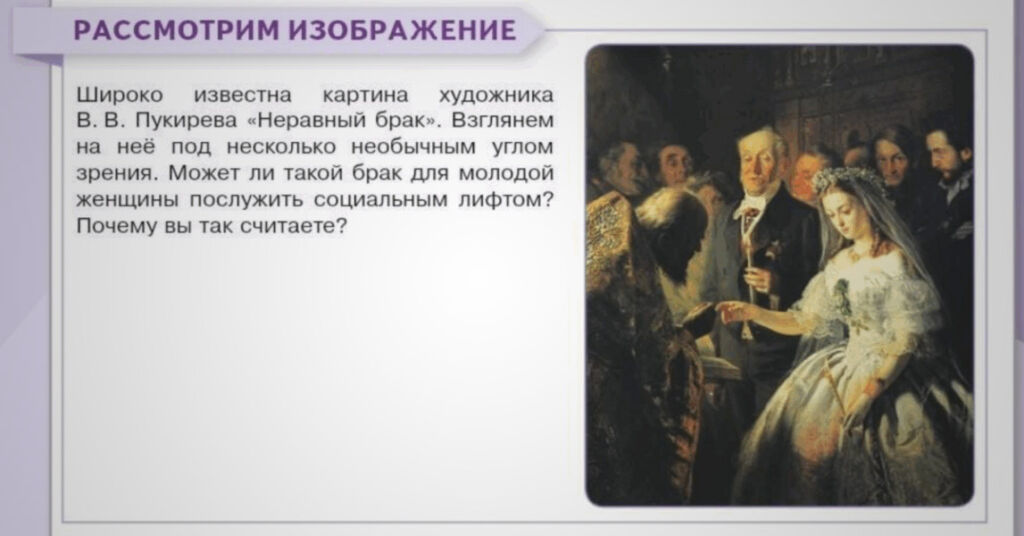 Ученикам старших классов предлагают и другие сомнительные идеи. Например, на уроке о социальной структуре общества в 9-м классе предлагают ученикам рассмотреть знаменитую картину Василия Пукирева «Неравный брак» и поразмышлять, может ли такой союз послужить для молодой девушки социальным лифтом.